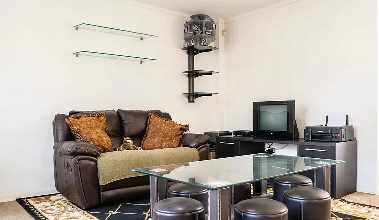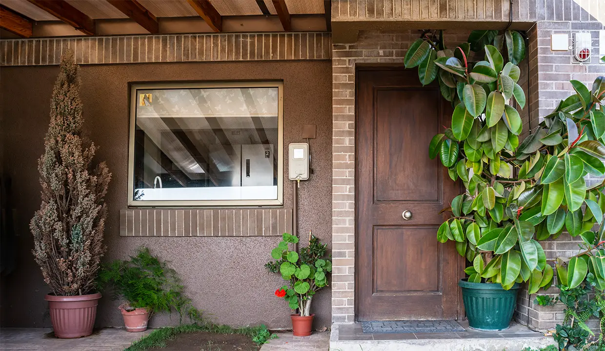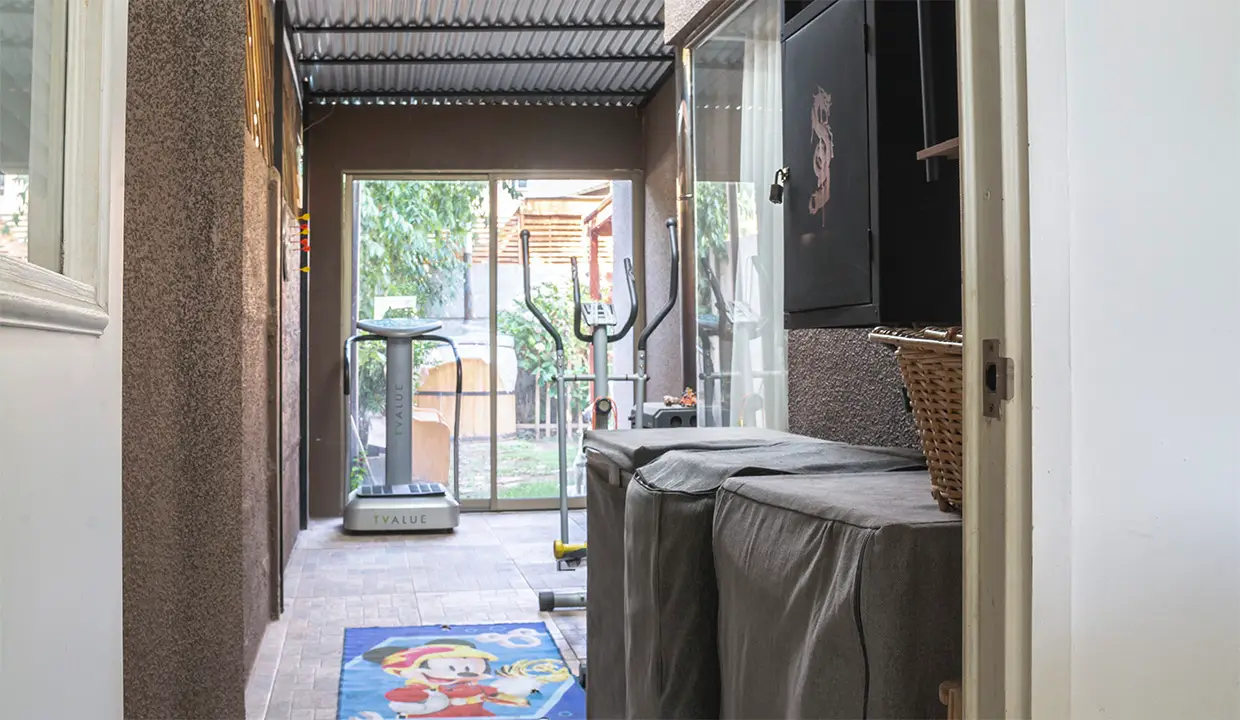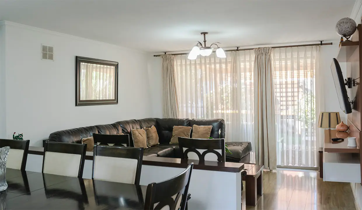 El acceso a la vivienda se realiza por un portón automatizado que da paso a un estacionamiento cubierto para dos vehículos, acompañado de un cuidado jardín con césped y vegetación ornamental. Un hall de entrada da la bienvenida al interior de la casa, conectando con un amplio y luminoso living-comedor, donde un murete de diseño separa sutilmente ambos ambientes. Grandes ventanales de muro a muro integran visualmente la casa con el patio posterior, llenando de luz natural los espacios.
