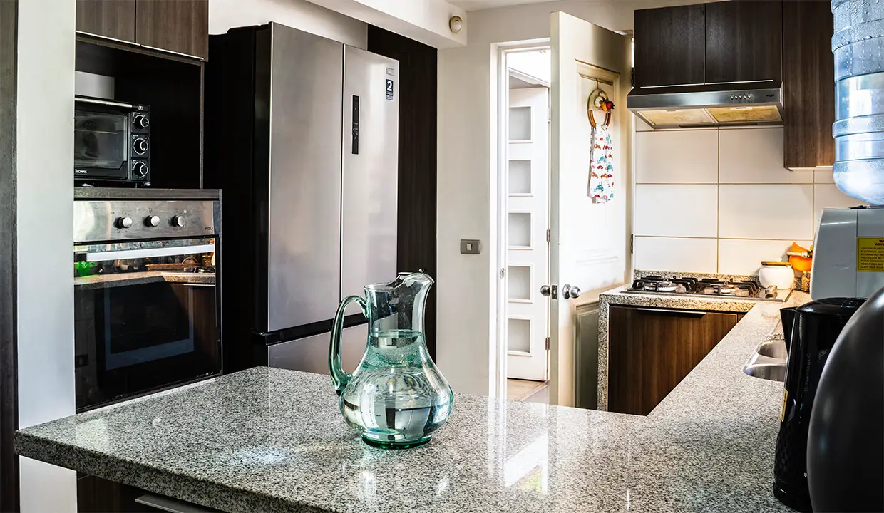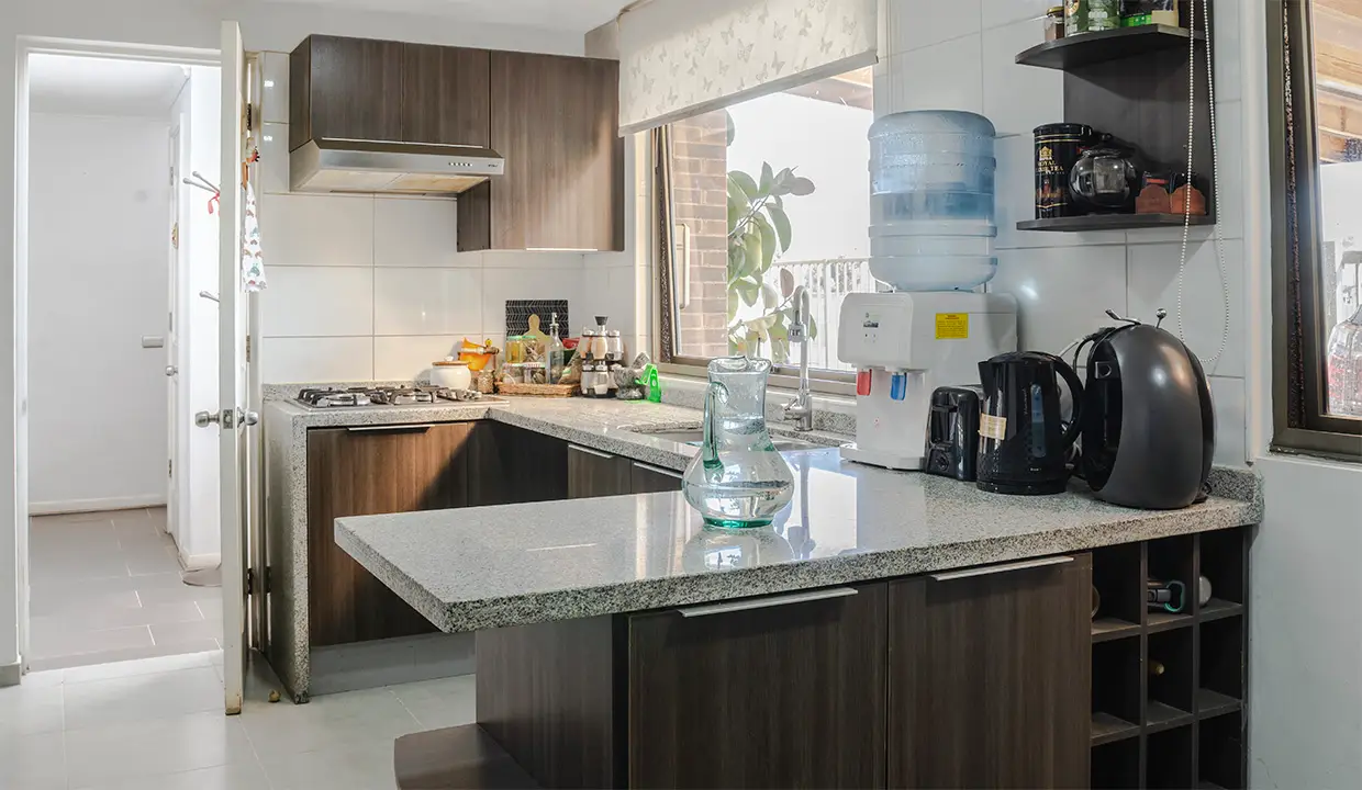 La cocina, de estilo cerrado y completamente amoblada, incluye comedor de diario, encimera a gas natural, horno y campana eléctrica, junto a una funcional logia y una espaciosa área de servicio techada.